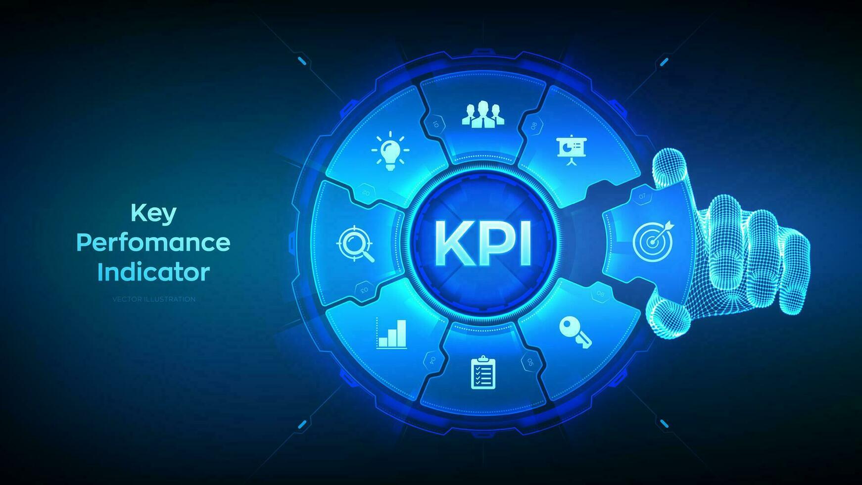 KPI. Key performance indicator business and industrial analysis technology concept on virtual screen. Wireframe hand places an element into a composition visualizing KPI. Vector illustration. Pro Vector