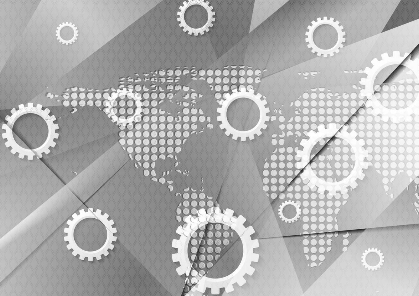 Grey hi-tech abstract background with dotted map and gears Pro Vector