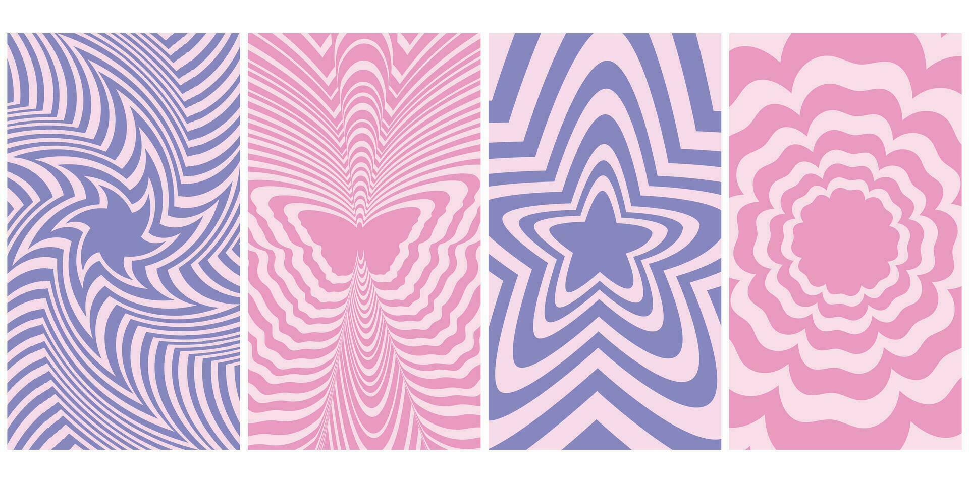 Set with geometric backgrounds. Vector illustration of abstract backgrounds with geometric shapes and hearts. Nostalgia for the year 2000, Y2k style. Design template. Hypnotic pattern. Vector Pro Vector