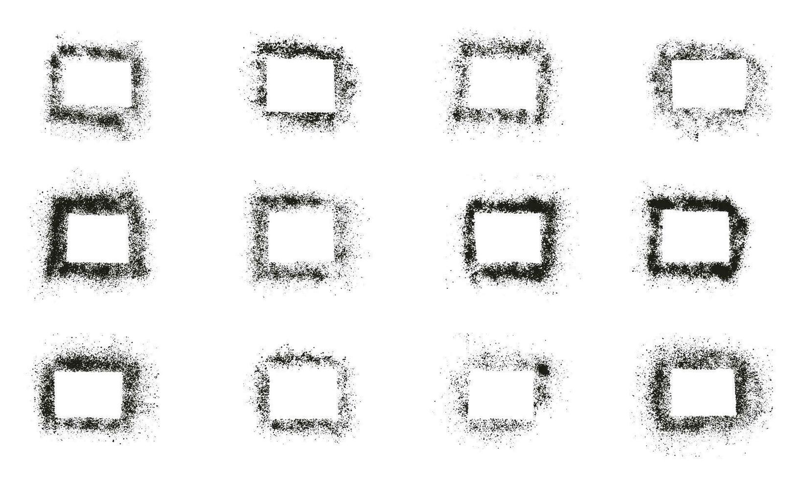 Square Frame Spray with Grainy Texture Set. Grunge Border in Rectangle Shape Collection. Paint Brush Grain on White Background. Black Abstract Graphic Design Element. Isolated Vector Illustration. Pro Vector