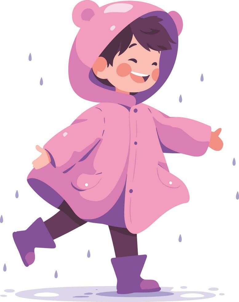 Hand Drawn A child in a raincoat showing a joyful expression that it is raining in flat style Pro Vector