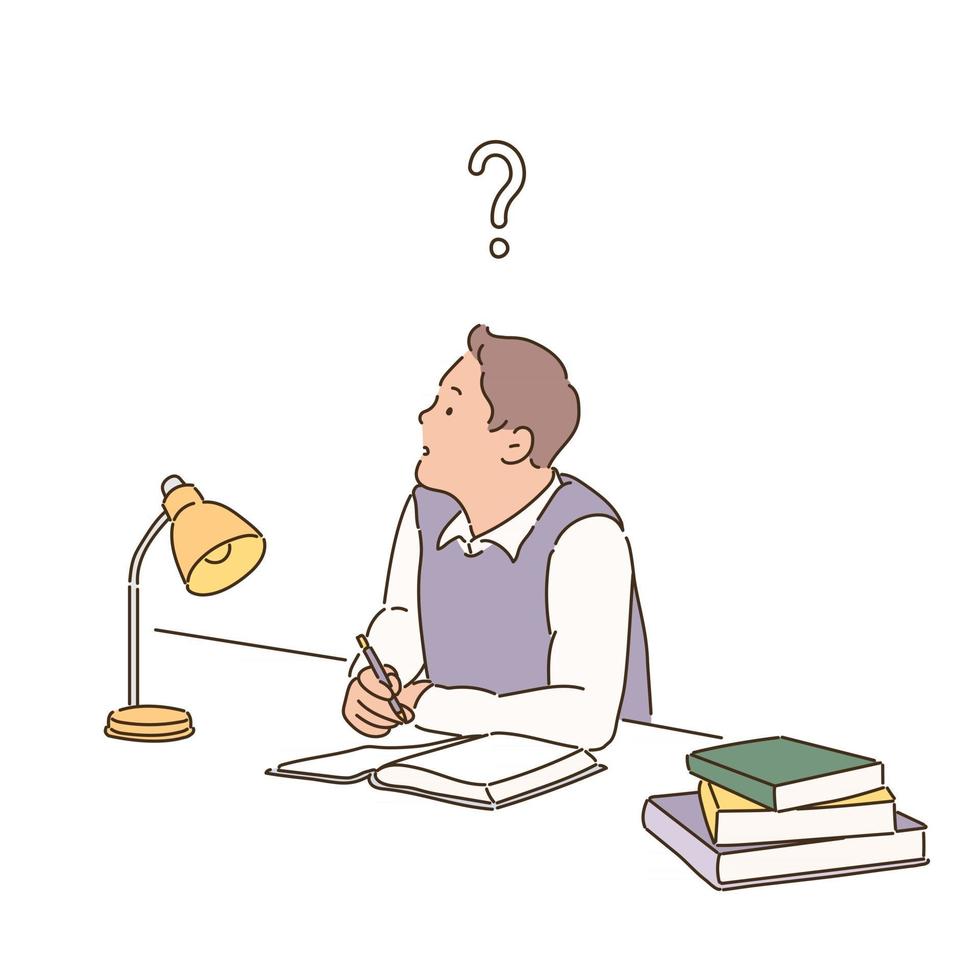 A question mark is floating on the head of a student studying at the desk. hand drawn style vector design illustrations. Pro Vector