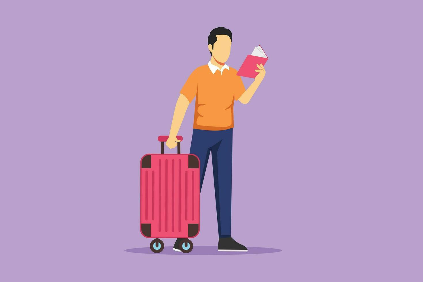 Cartoon flat style drawing of man reading textbook. Smart male student standing with open book in hands and suitcase. Enthusiastic reader for educational and hobby. Graphic design vector illustration Pro Vector