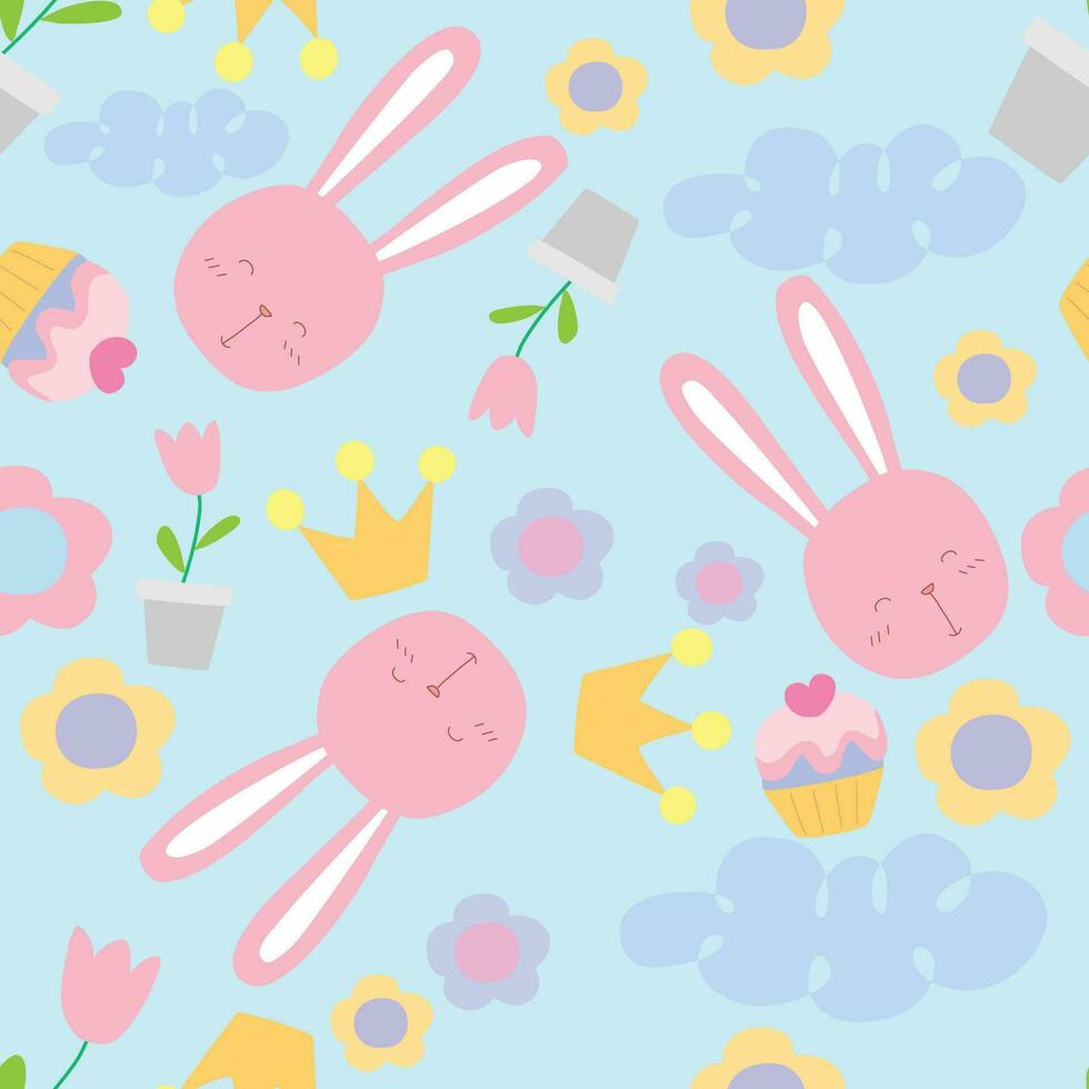 seamless pattern a bunny and cupcake pattern with flowers and trees Pro Vector