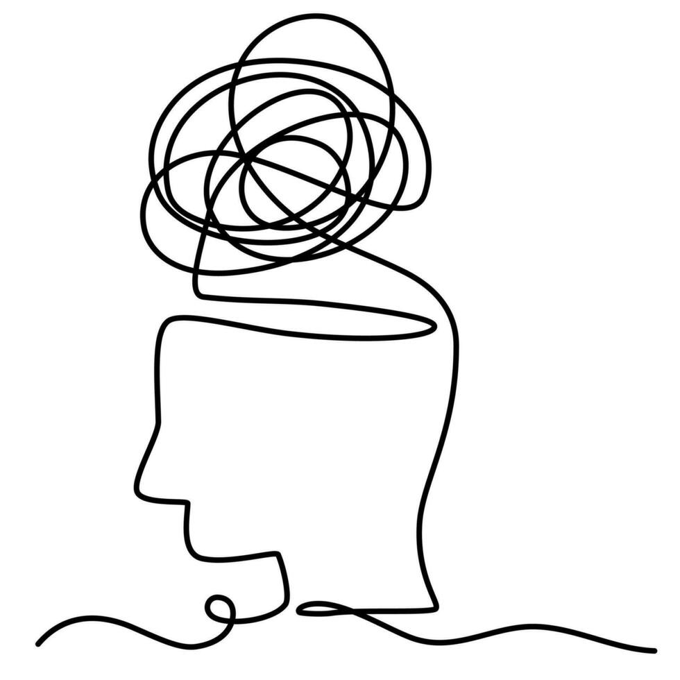 Person with confused feelings worried about bad mental health. Problems, failure and grief concept. Continuous one line drawing with a head and a tangled line. Lineart Vector illustration Pro Vector