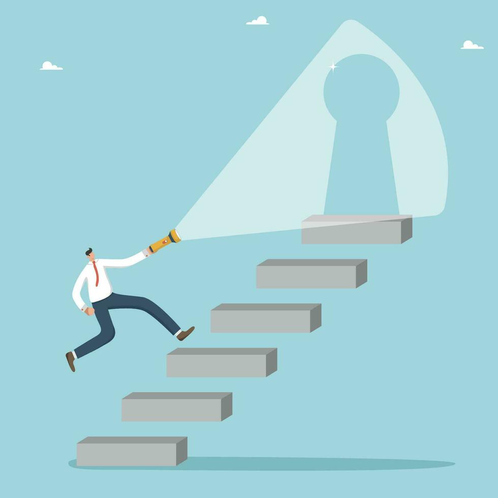 Find way out of difficult situation or solution to problem, secret key to achieve heights in business, motivation to discover new opportunities, man runs up the stairs and shines flashlight on keyhole Pro Vector