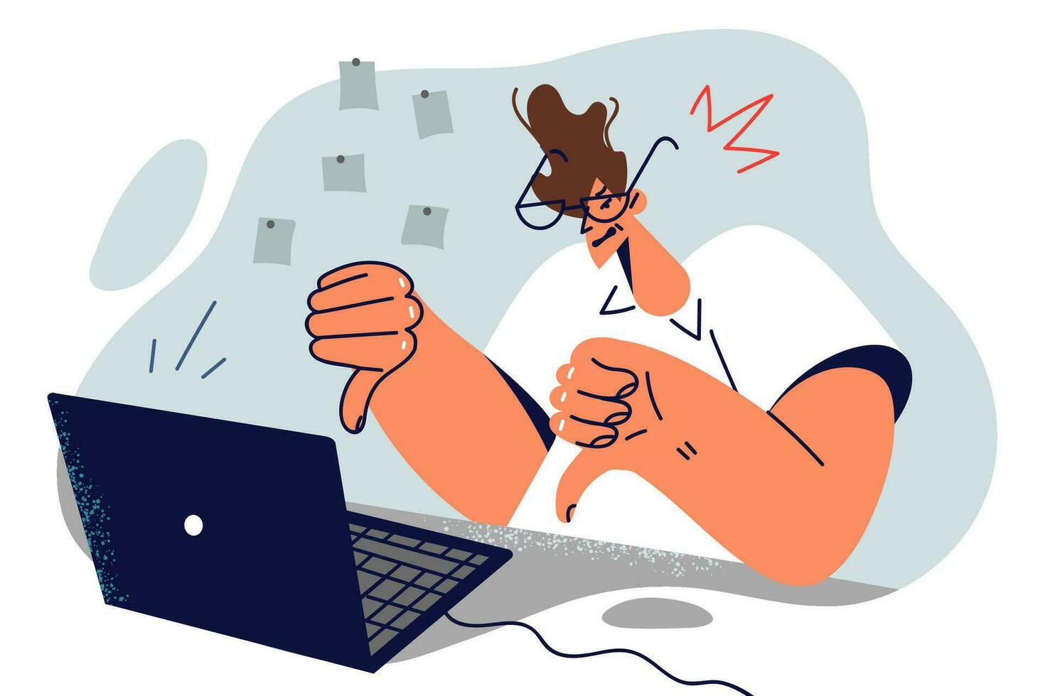 Dissatisfied man freelancer showing thumbs down sitting at table with laptop and calling for fixing software bugs. Dissatisfied guy programmer showing negative feedback during video call Pro Vector