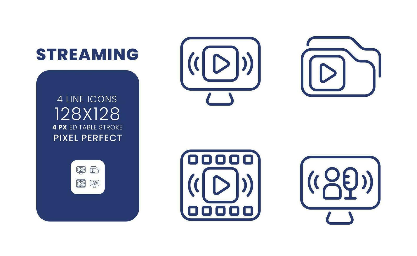 Streaming linear desktop icons set. Media content. Live tv. Online broadcasting platform. Pixel perfect 128x128, outline 4px. Isolated user interface elements pack for website. Editable stroke Pro Vector