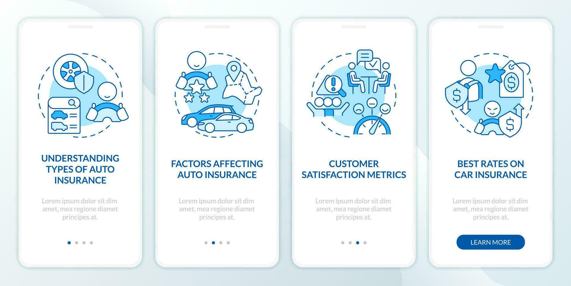 Choosing auto insurance service blue onboarding mobile app screen. Walkthrough 4 steps editable graphic instructions with linear concepts. UI, UX, GUI template Pro Vector