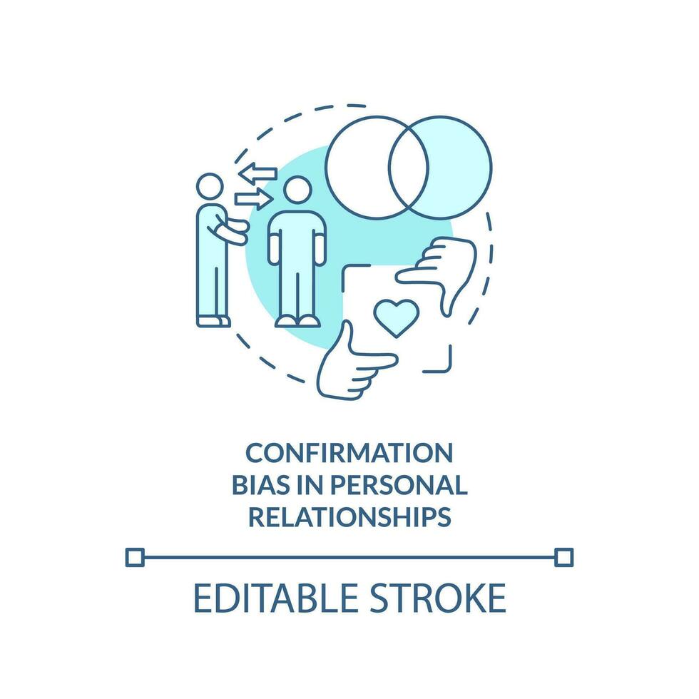Confirmation bias in relationships turquoise concept icon. Common cognitive prejudice abstract idea thin line illustration. Isolated outline drawing. Editable stroke Pro Vector
