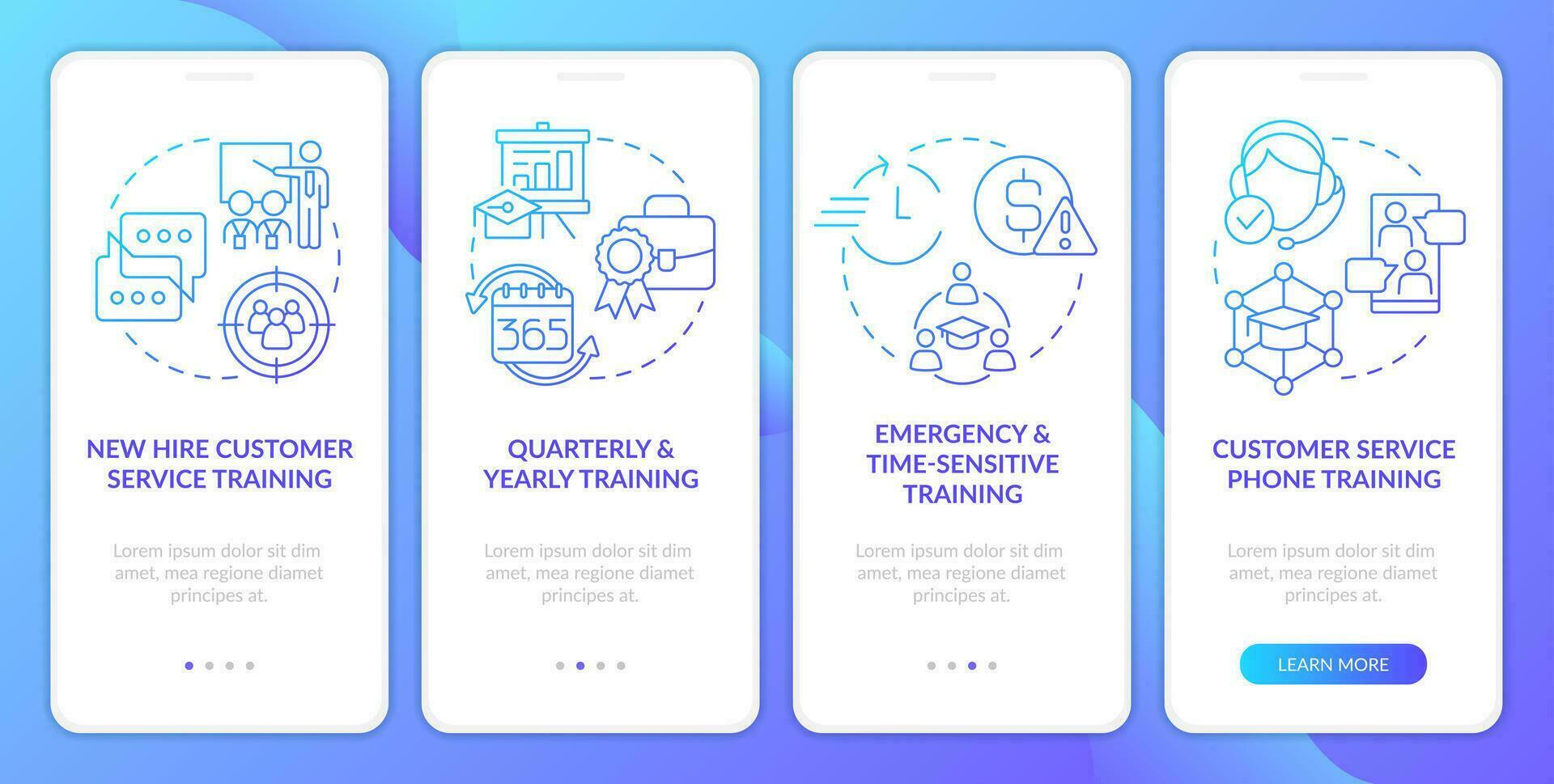 Customer service trainings blue gradient onboarding mobile app screen. Business walkthrough 4 steps graphic instructions with linear concepts. UI, UX, GUI template Pro Vector