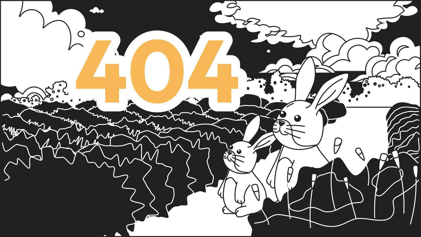 Dreamy rabbits looking on sky black white error 404 flash message. Monochrome website landing page ui design. Not found cartoon image, kawaii vibes. Vector flat outline illustration concept Pro Vector