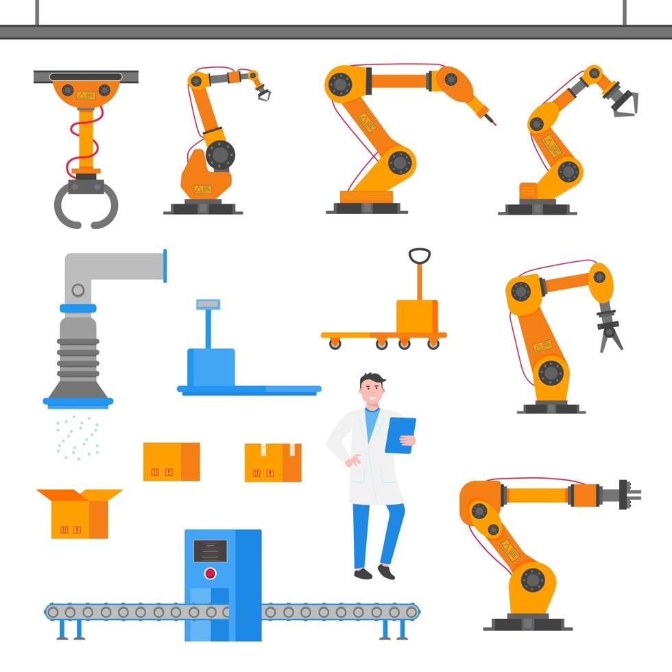 Factory elements set flat style design with cardboard boxes, ventilation, conveyor, robot arm, box with lid, industrial scales, open box, trolley, automated line, operator isolated on white. Pro Vector