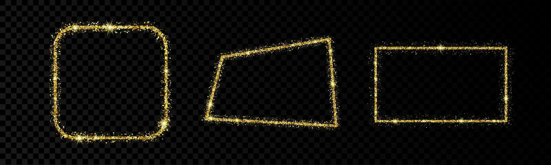 Shiny frames with glowing effects. Set of three glitter gold rectangle, rounded square and trapezoid frames Pro Vector