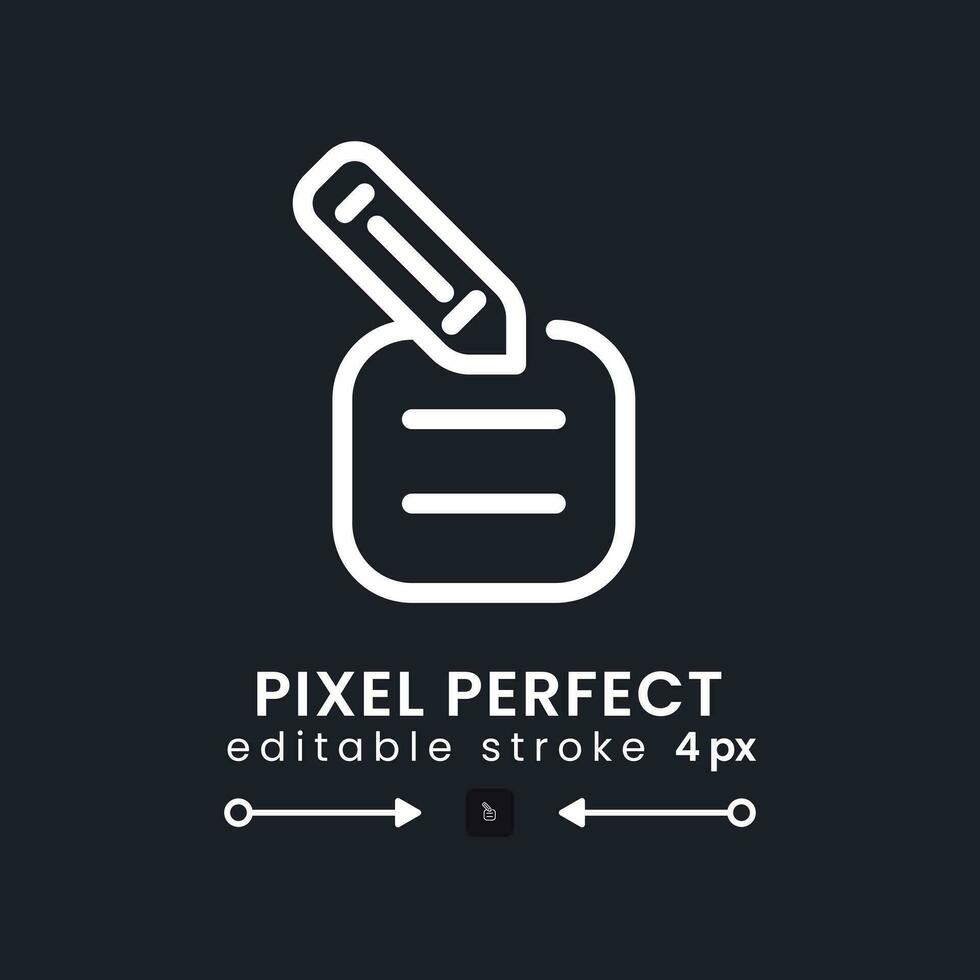 Note with pencil white linear desktop icon on black. Edit information. Working tool. Online notepad. Pixel perfect, outline 4px. Isolated user interface symbol for dark theme. Editable stroke Pro Vector