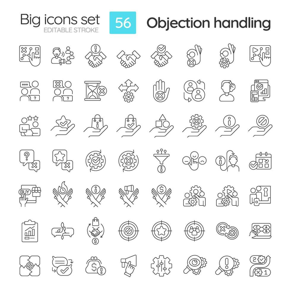 Objection handling linear icons set. Sales negotiation. Successful deal. Potential customer. Build trust. Customizable thin line symbols. Isolated vector outline illustrations. Editable stroke Pro Vector