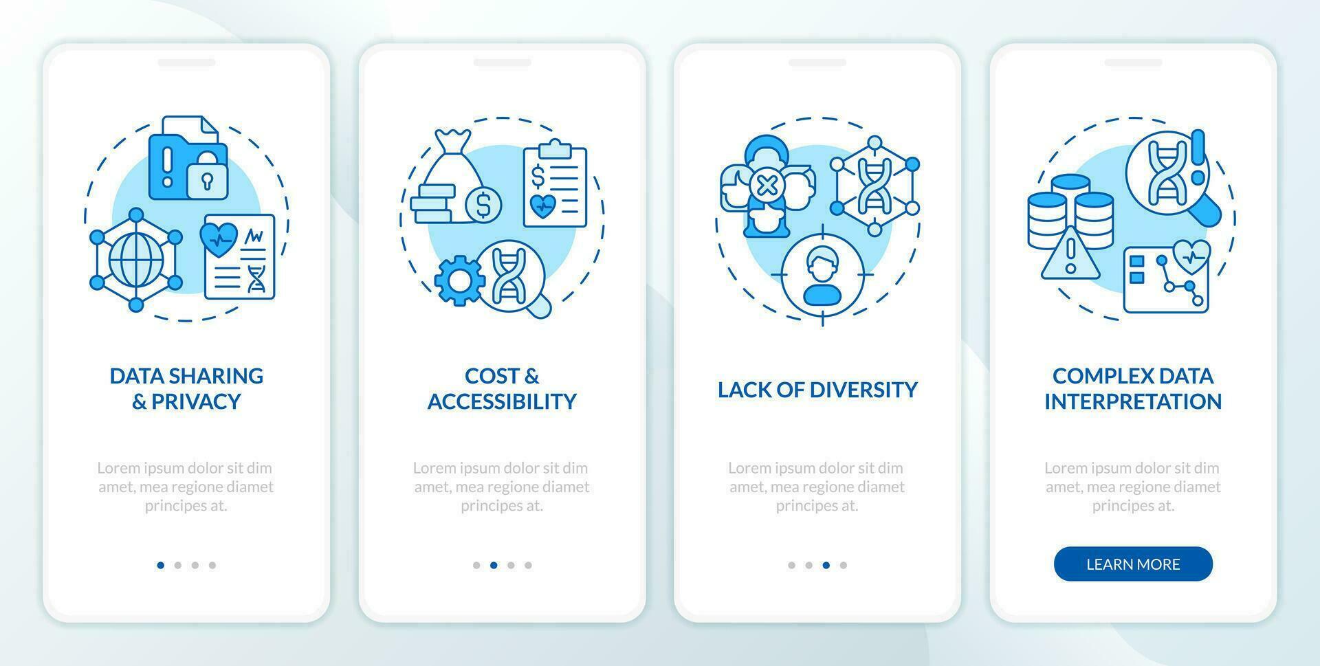 Challenges and limitations blue onboarding mobile app screen. Genetics walkthrough 4 steps editable graphic instructions with linear concepts. UI, UX, GUI template Pro Vector and Pro SVG