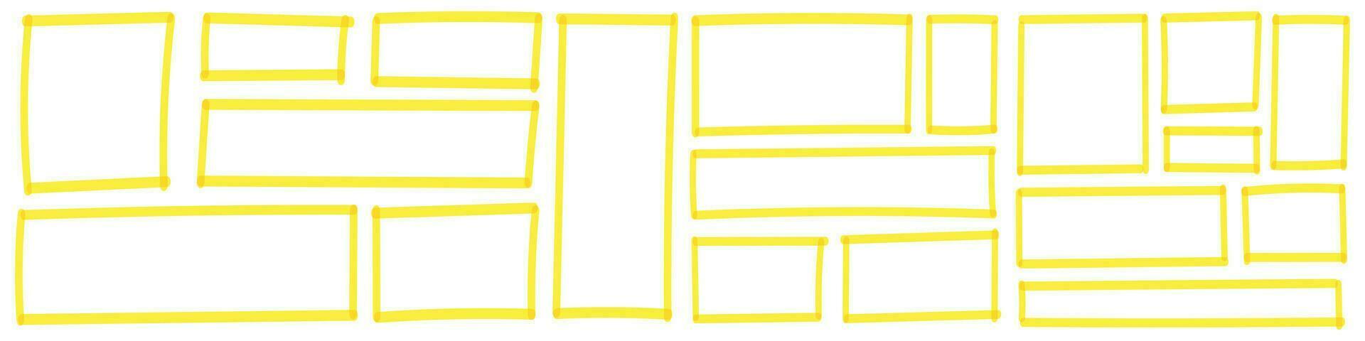 Grunge box and frame with yellow markers brush and stamp effects. Square and rectangular lines in sketch style, Flat vector illustration isolated on white background. Pro Vector