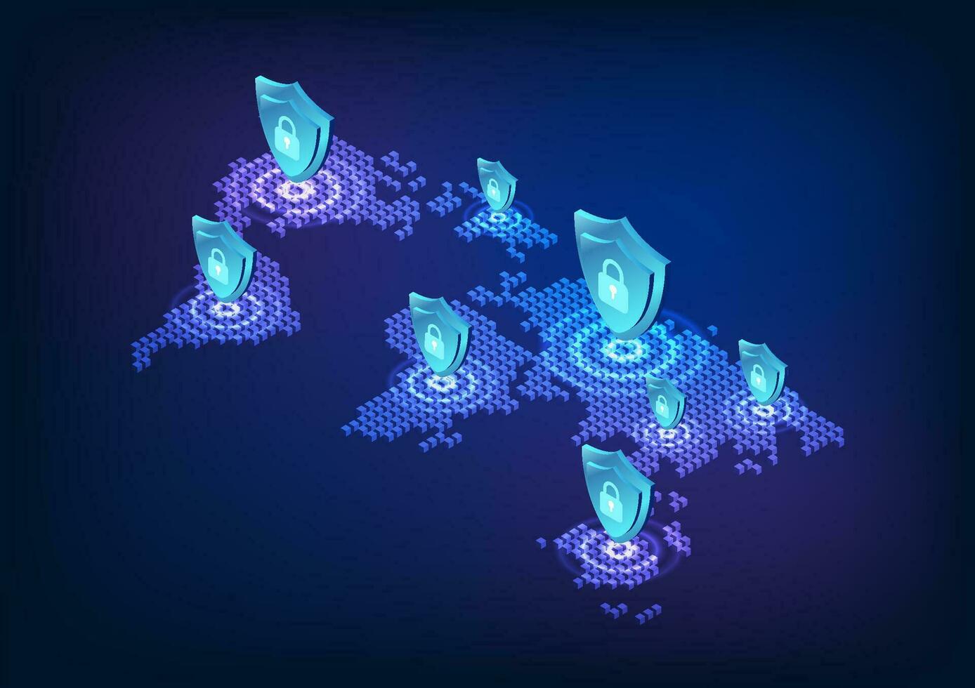 World map mixed with technology The pixelated world map above features a shield and a lock representing modern global technology that protects data from being stolen or lost. Pro Vector