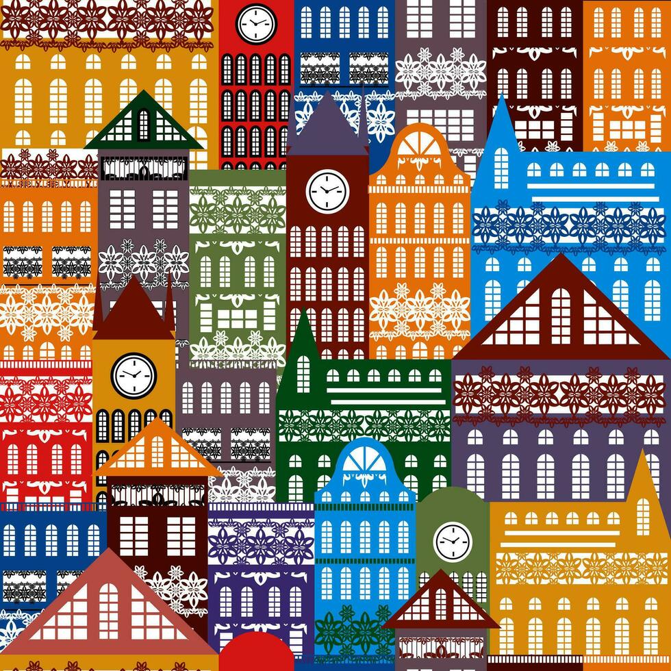 Vector background seamless pattern, consisting of simple houses with patterns in the form of snowflakes on the facades. EPS 10 Free Vector