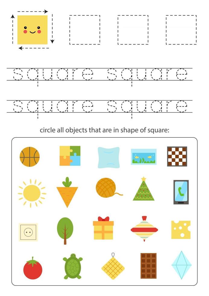 Learning basic geometric form for children. Find square objects. Pro Vector