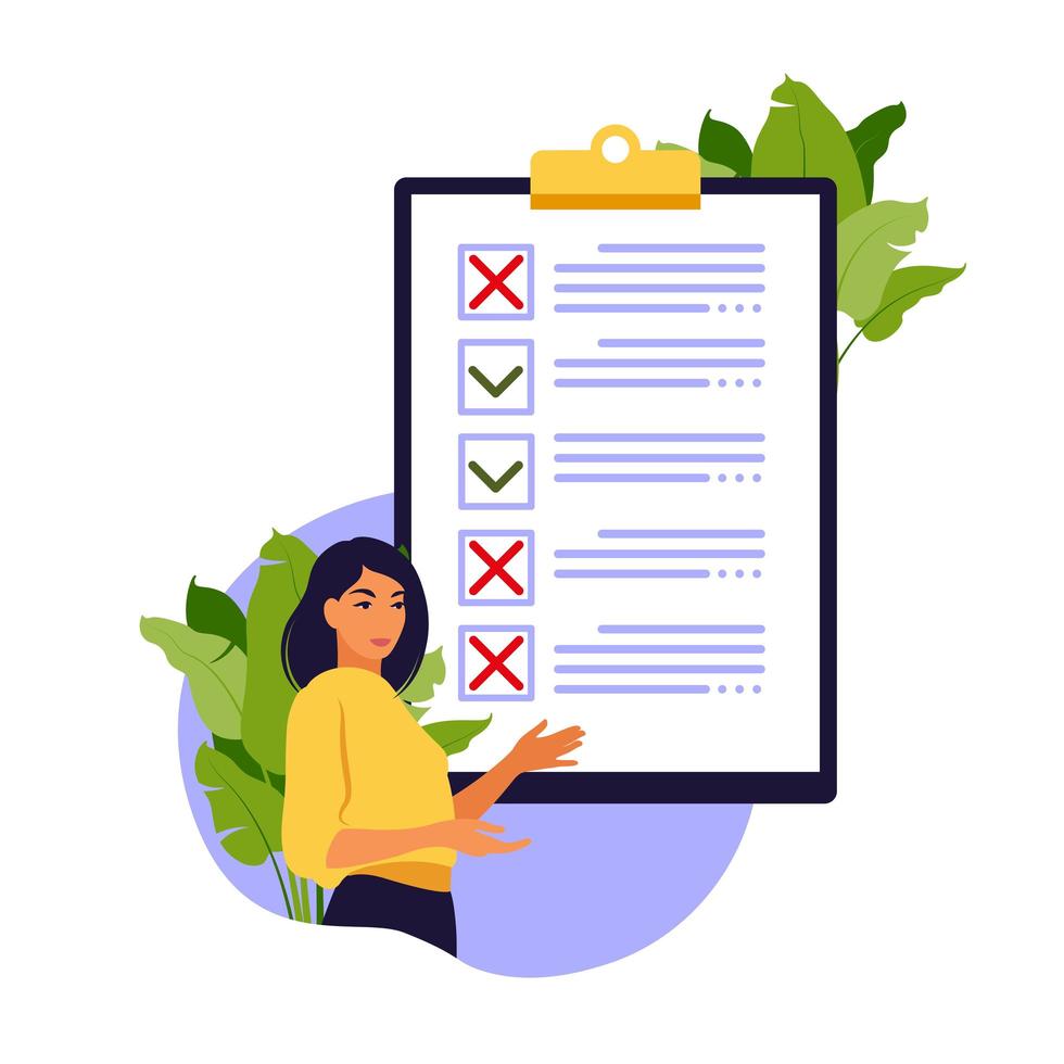 Survey of customer satisfaction. Piece of paper with ticks and crosses. Small people characters fill out a form. Vector illustration. Flat style. Pro Vector