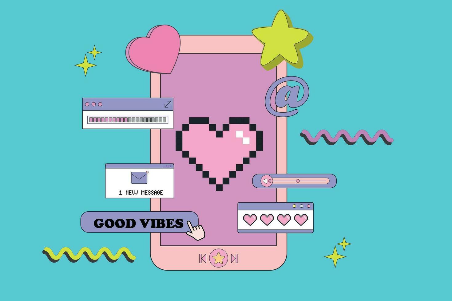 Smartphone with user interface elements in retro style. Phone with user interface elements. Old computer aestethic. Retro pc elements, user interface. Nostalgia for 1990s -2000s. Vector illustrations. Pro Vector