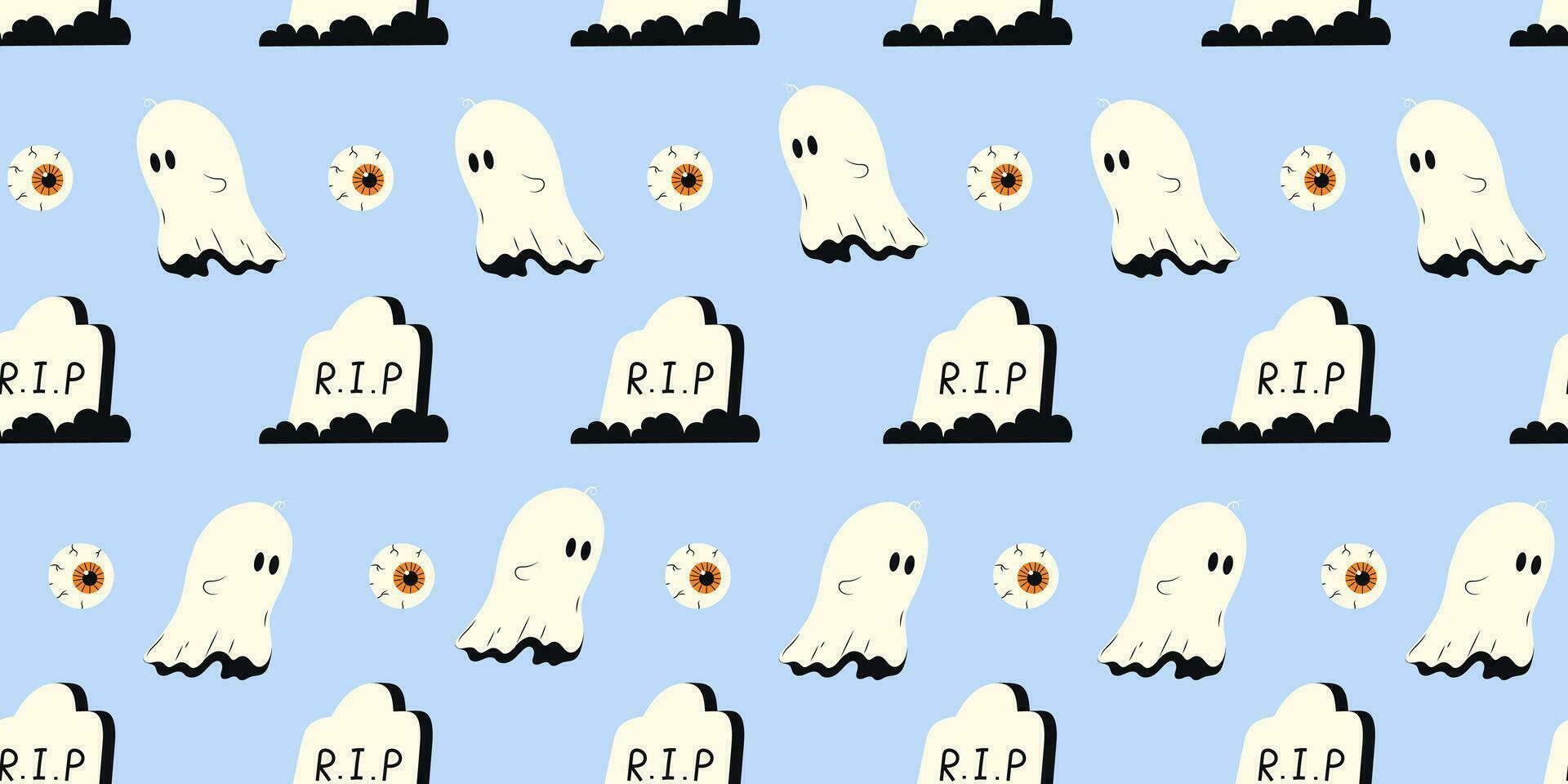 Cute Halloween seamless pattern with ghost, tombstone and eyes on pink background. Halloween various elements. Pattern for wrapping paper and print design. Vector stock illustration in cartoon style.