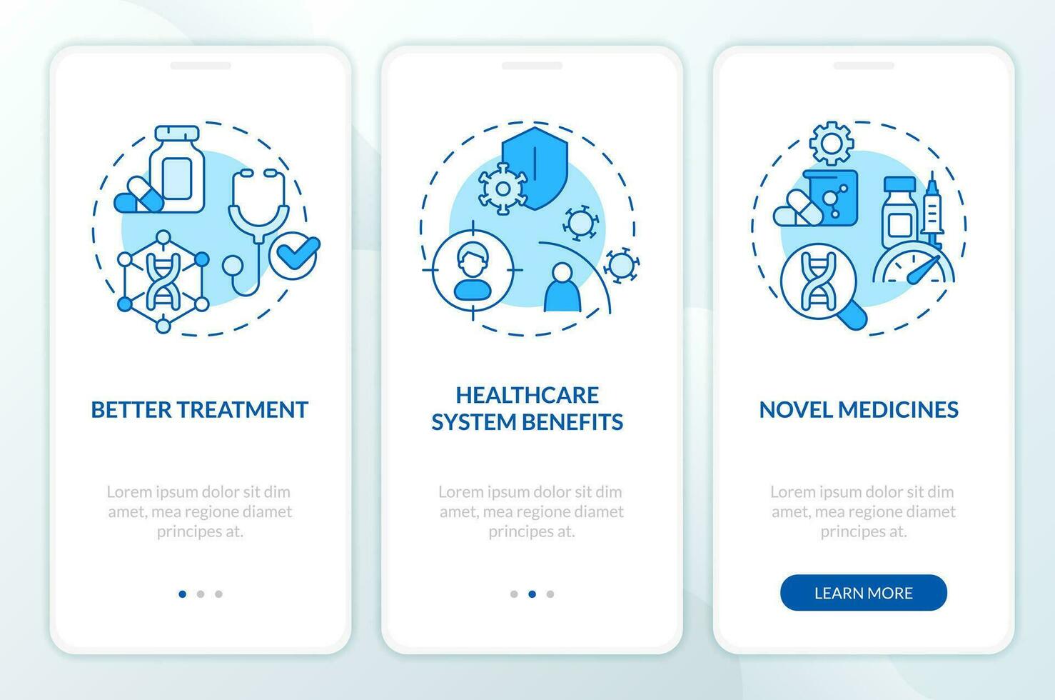 Benefits of precision medicine blue onboarding mobile app screen. Walkthrough 3 steps editable graphic instructions with linear concepts. UI, UX, GUI template Pro Vector and Pro SVG