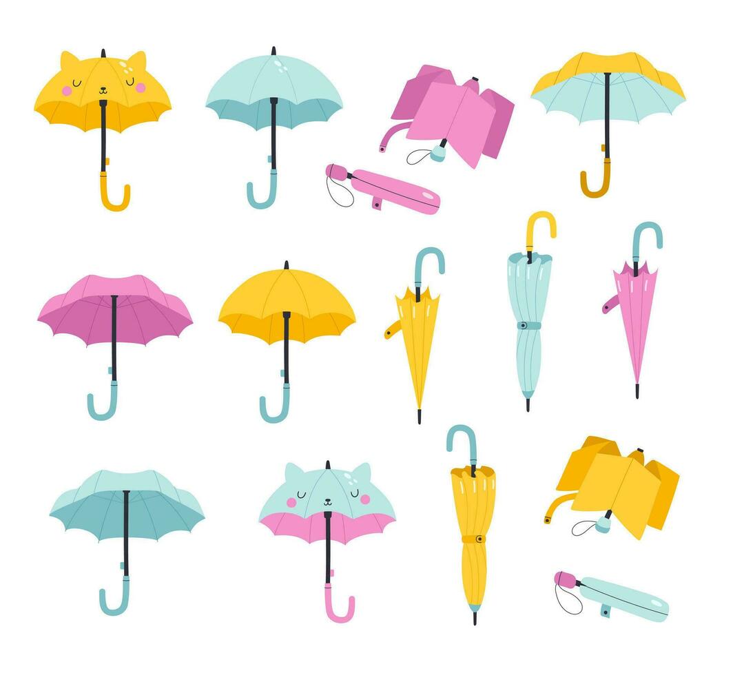 Set of Umbrellas in various positions. Open and folded umbrellas. Hand drawn Vector illustration. Pro Vector