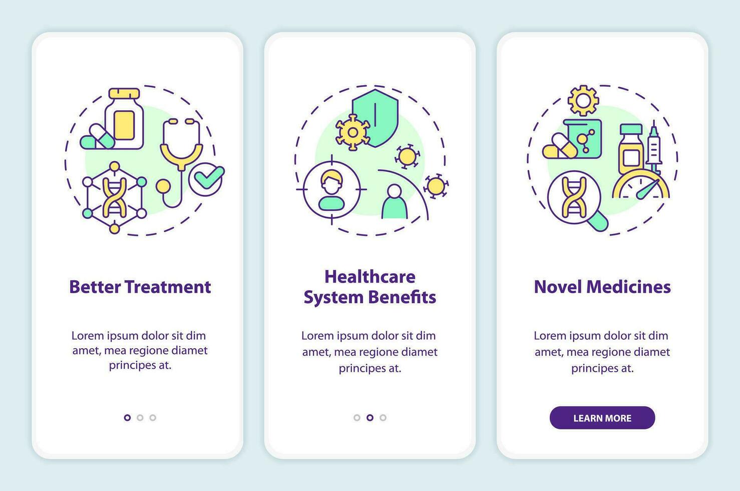 Benefits of precision medicine onboarding mobile app screen. Genomics walkthrough 3 steps editable graphic instructions with linear concepts. UI, UX, GUI template Pro Vector