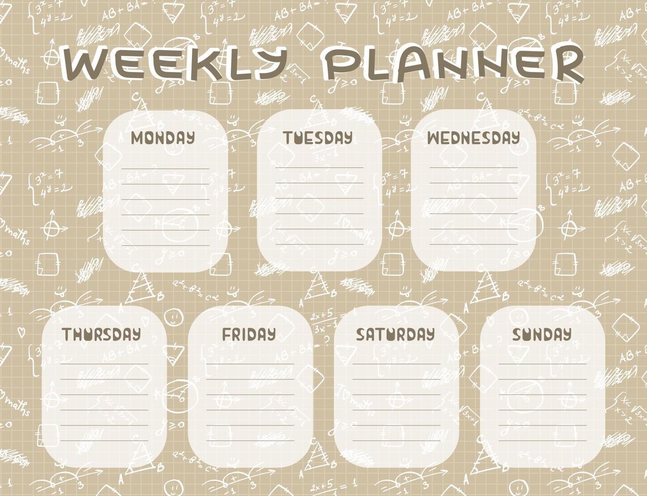 Beige and White Weekly planner on mathematical pattern, which consists of formulas and simple shapes, smile and heart symbol Pro Vector