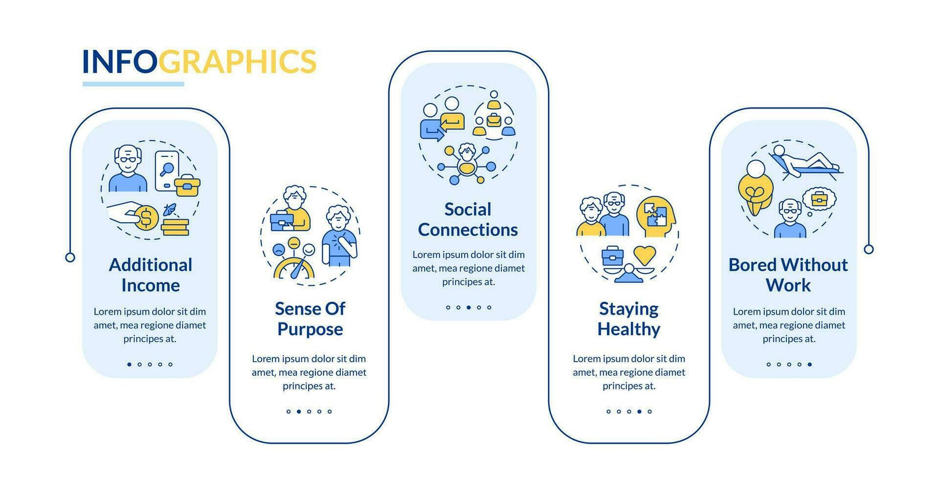 2D unretirement vector infographics template, data visualization with 5 steps, process timeline chart. Pro Vector