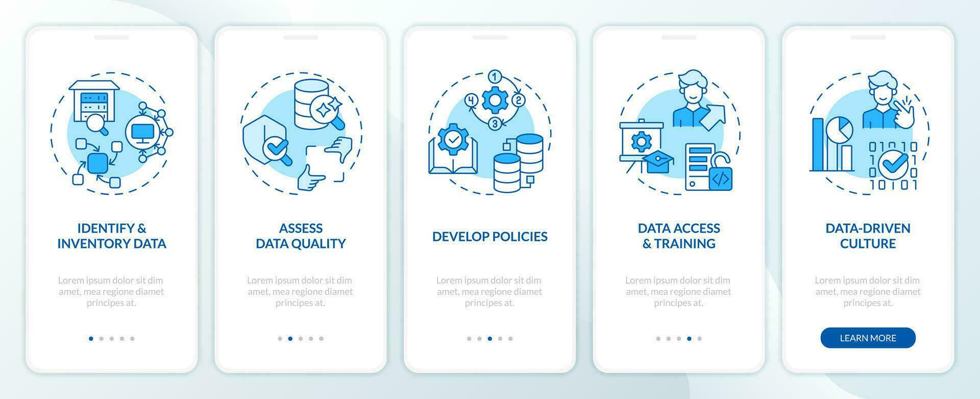 2D blue linear icons representing data democratization mobile app screen set. 5 steps graphic instructions, UI, UX, GUI template. Pro Vector and Pro SVG