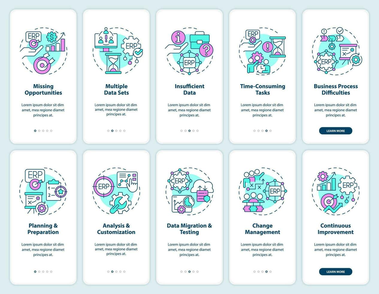 2D icons representing enterprise resource planning mobile app screen set. Walkthrough 5 steps graphic instructions with thin line icons concept, UI, UX, GUI template. Pro Vector