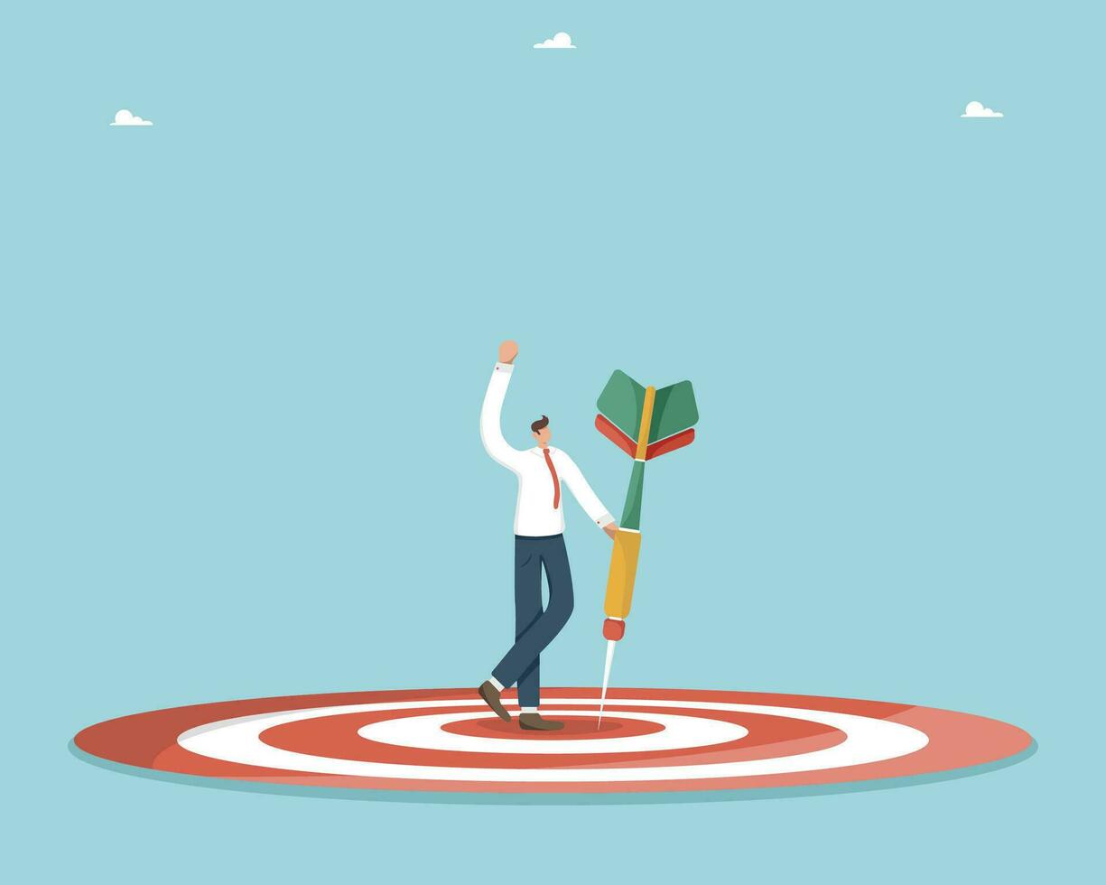 Winning strategy, accuracy in setting goals and their successful achievement, new opportunities for business, high results in completing business tasks, man with dart stands on target of dart board. Pro Vector