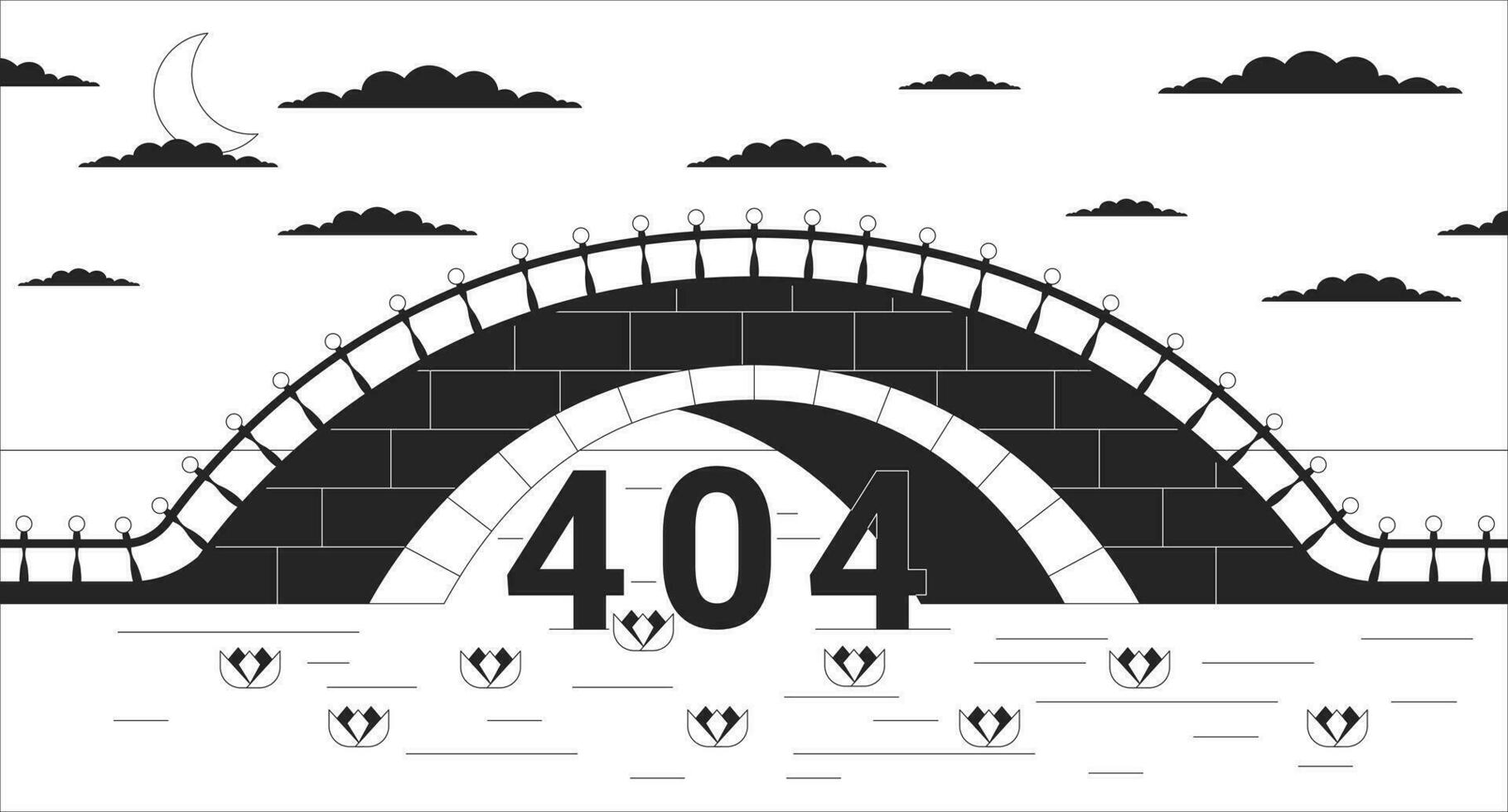 Twilight bridge across river black white error 404 flash message. Dusk above water lilies. Monochrome landing page ui design. Not found cartoon image, dreamy vibes. Vector flat outline illustration Pro Vector