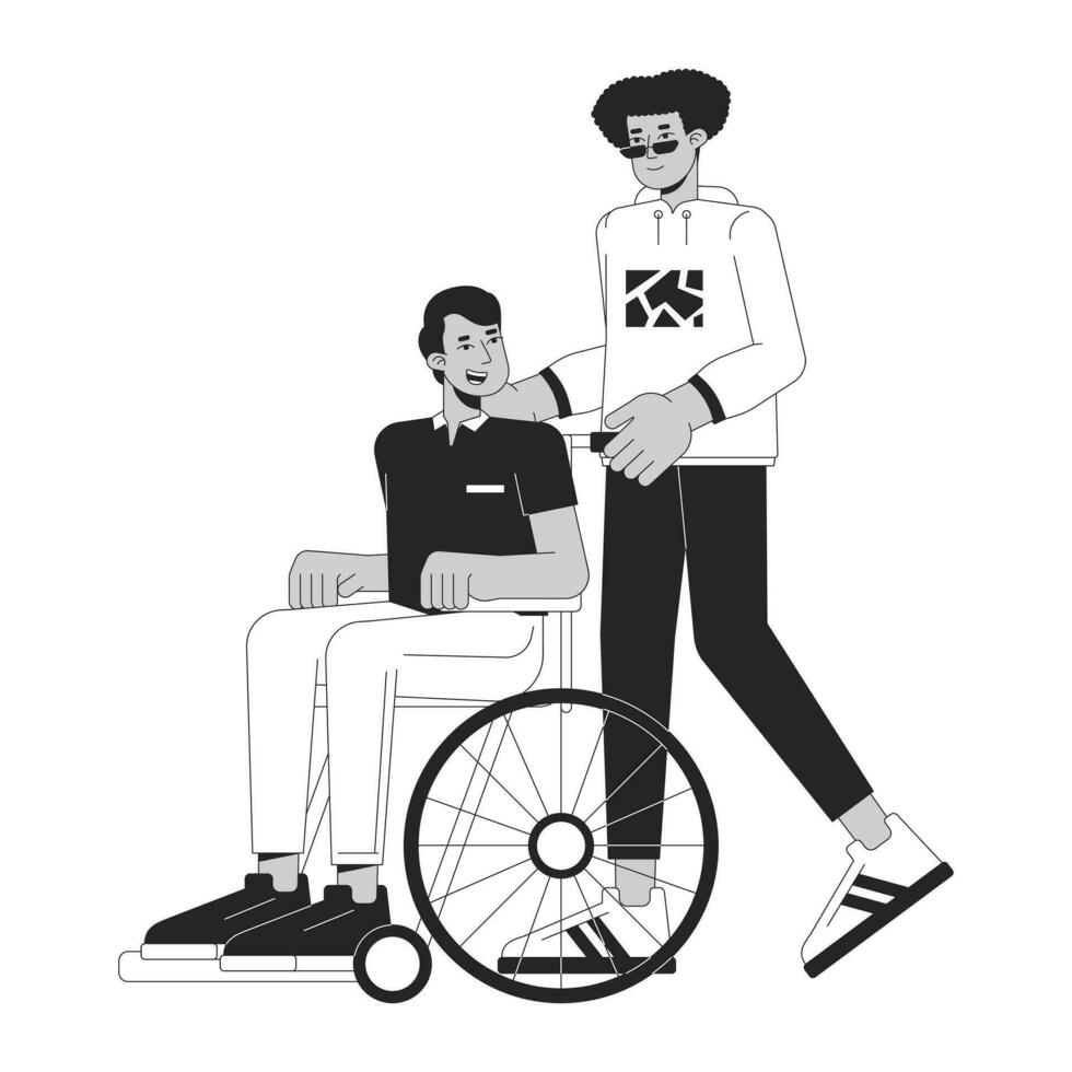 Caring of disabled person bw concept vector spot illustration. Man helping. Taking care. 2D cartoon flat line monochromatic characters on white for web UI design. Editable isolated outline hero image Pro Vector