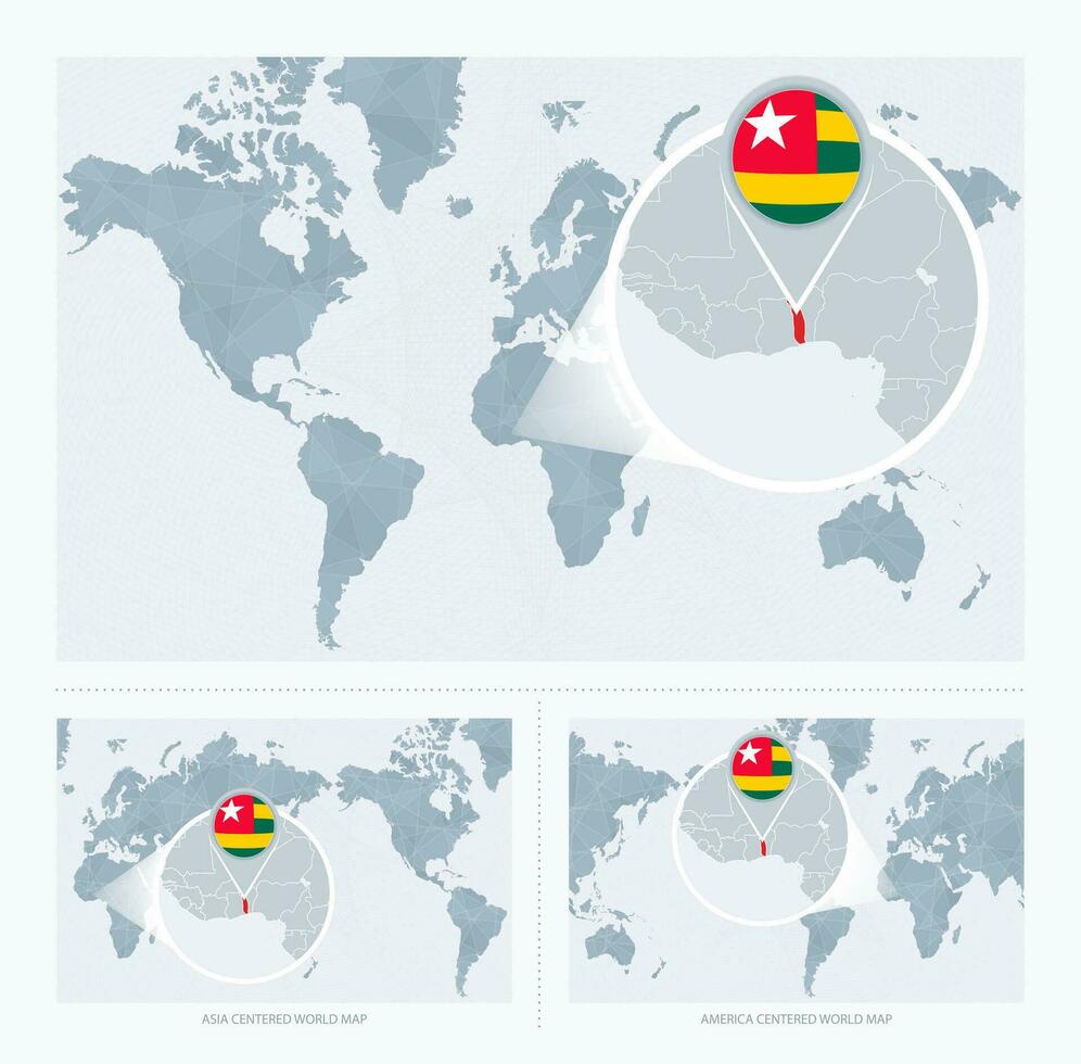 Magnified Togo over Map of the World, 3 versions of the World Map with flag and map of Togo. Pro Vector