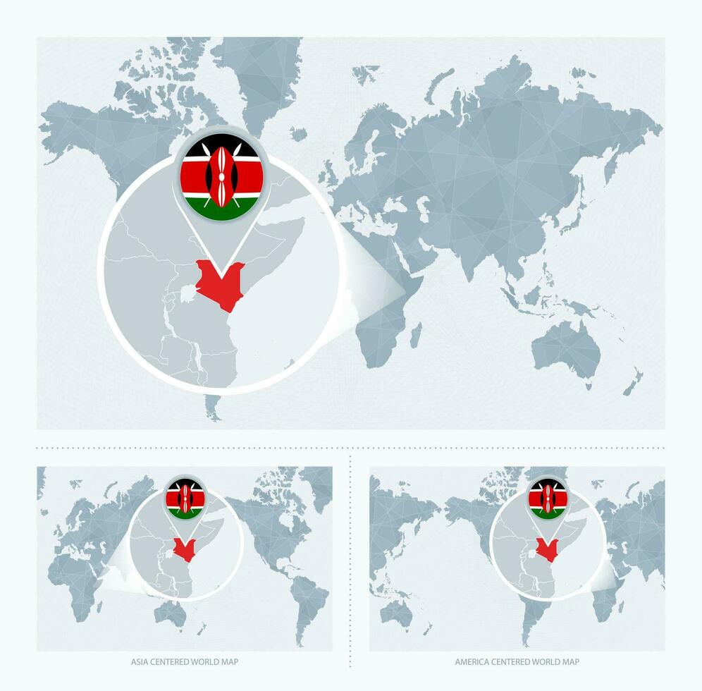Magnified Kenya over Map of the World, 3 versions of the World Map with flag and map of Kenya. Pro Vector