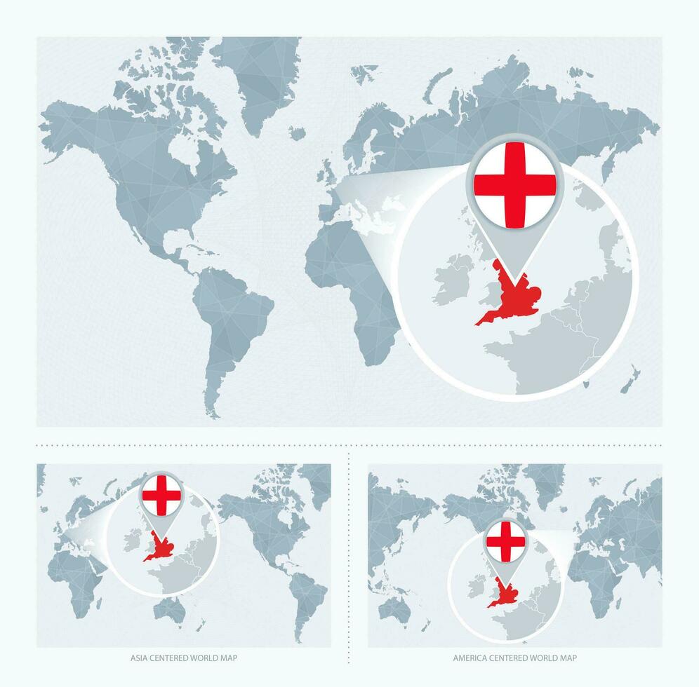 Magnified England over Map of the World, 3 versions of the World Map with flag and map of England. Pro Vector