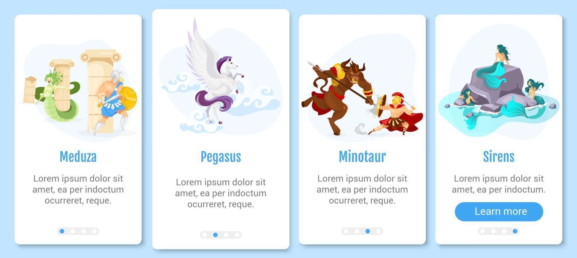 Greek mythology onboarding mobile app screen vector template. Mythological creatures and monsters. Walkthrough website steps with flat characters. UX, UI, GUI smartphone cartoon interface concept Pro Vector