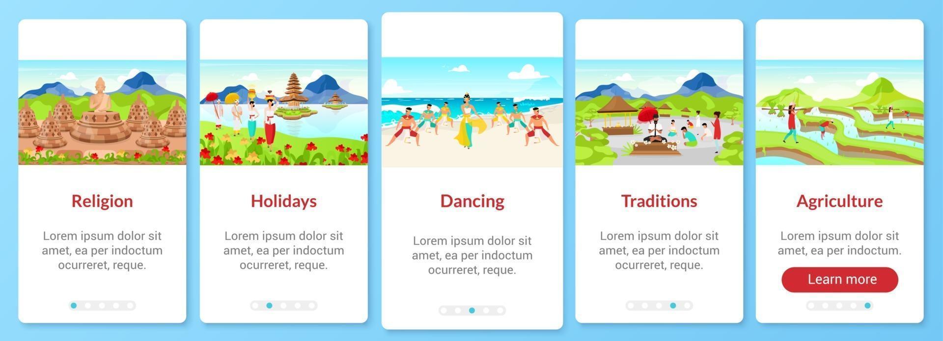 Indonesia culture onboarding mobile app screen vector template. Tourist attractions. Walkthrough website steps with flat characters. UX, UI, GUI smartphone cartoon interface concept Pro Vector