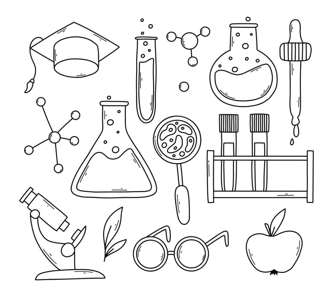Set of science elements in doodle style. Linear collection of scientific elements test tube, beaker, magnifier, microscope, pipette. Vector illustration. Pro Vector