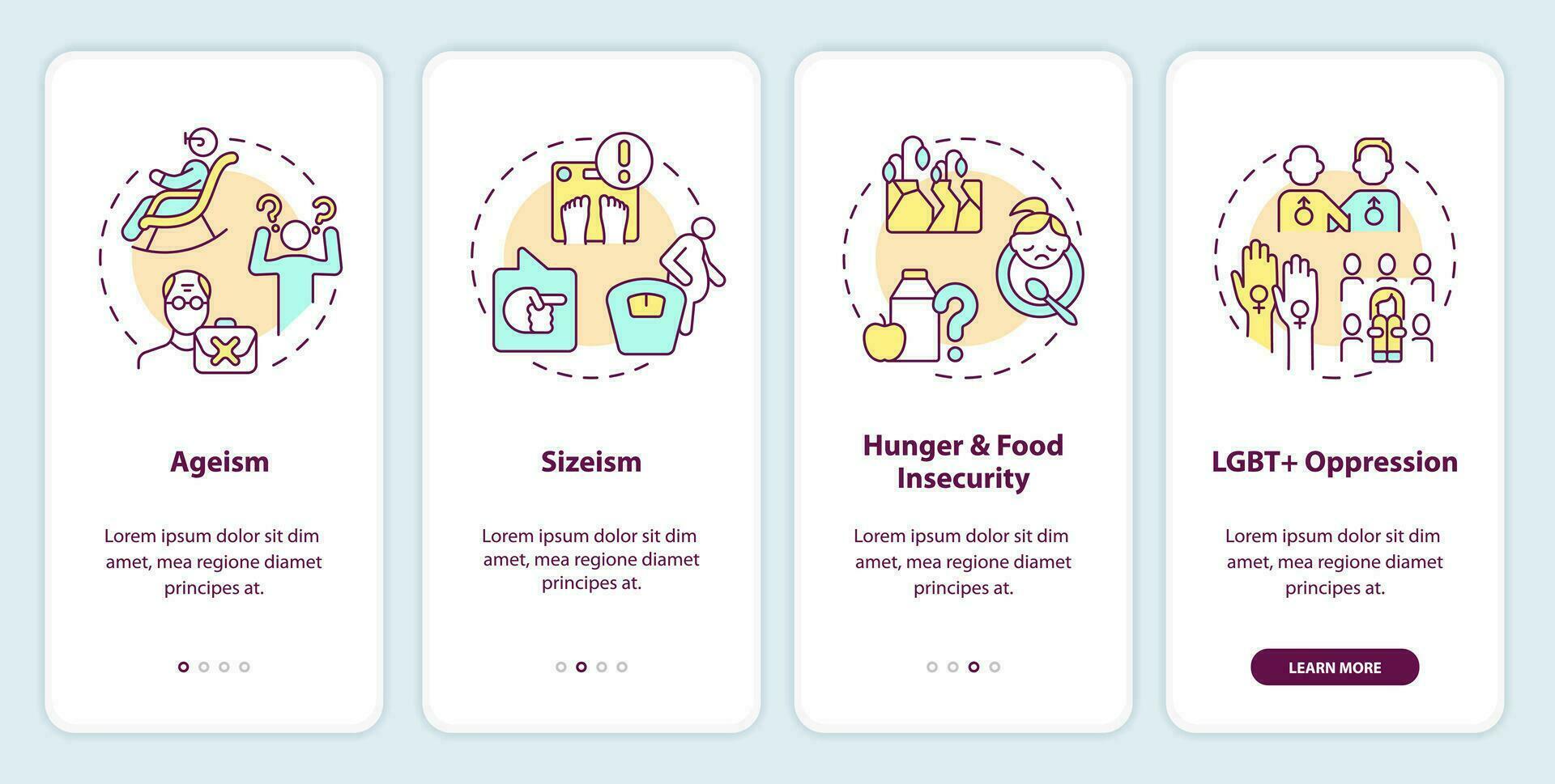 Social injustice examples onboarding mobile app screen. Walkthrough 4 steps editable graphic instructions with linear concepts. UI, UX, GUI template Pro Vector