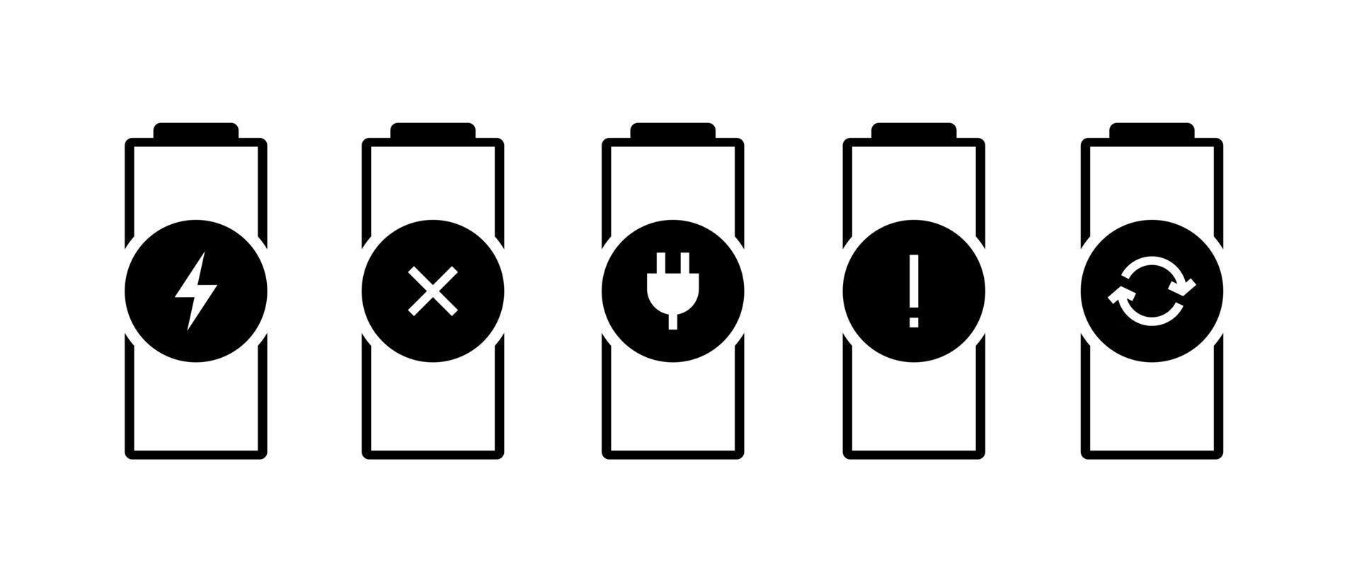 Battery charge indicator status icon set. Gadgets accumulator faulty broken needs charging error replace pictograms. Vector power illustration Pro Vector