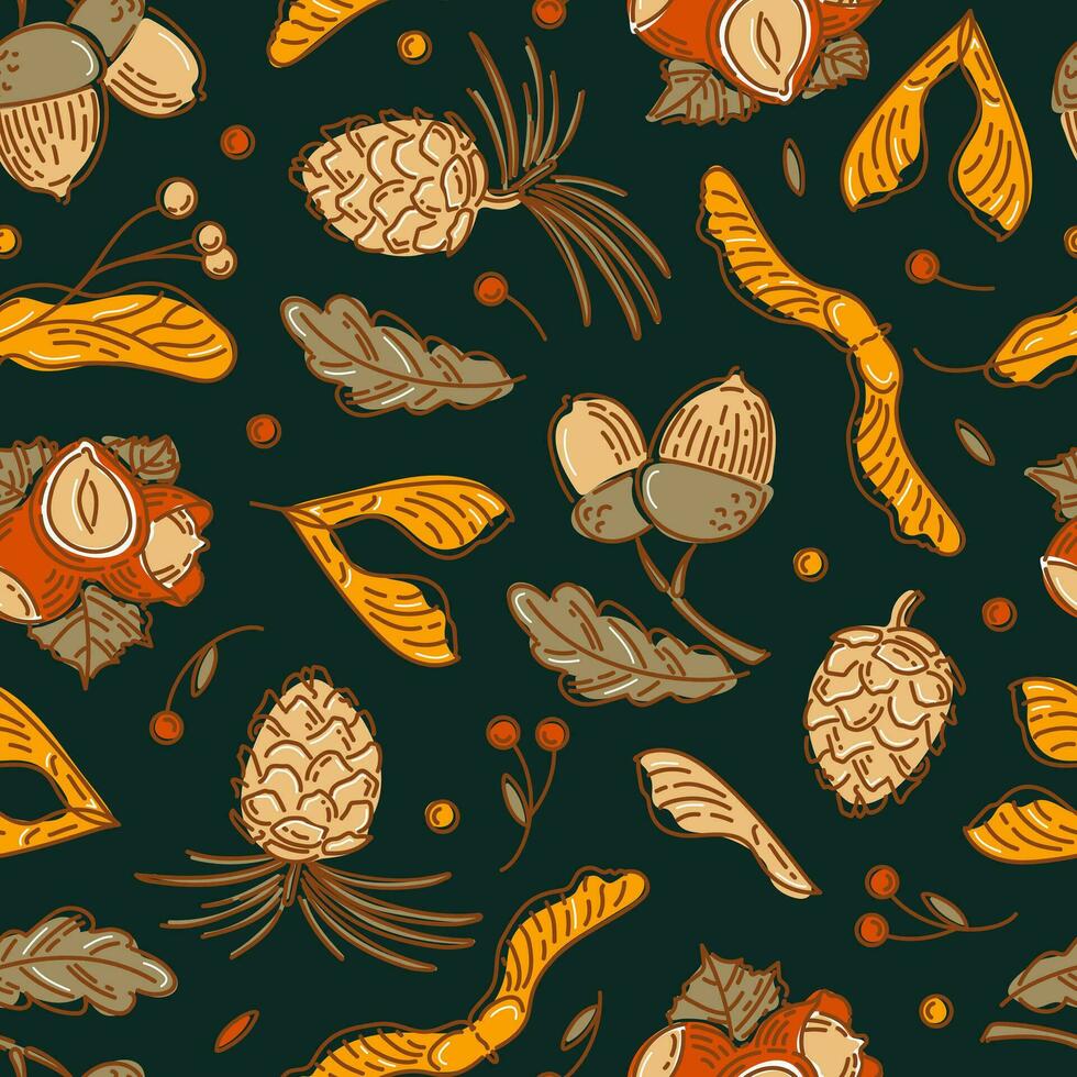 Hello, Autumn. Seamless pattern from nuts and seeds. Acorns with leaves, cedar cone, linden seeds, hazelnuts, maple lionfish seeds. sketch style. wallpaper, printing on fabric, wrapping, background Pro Vector