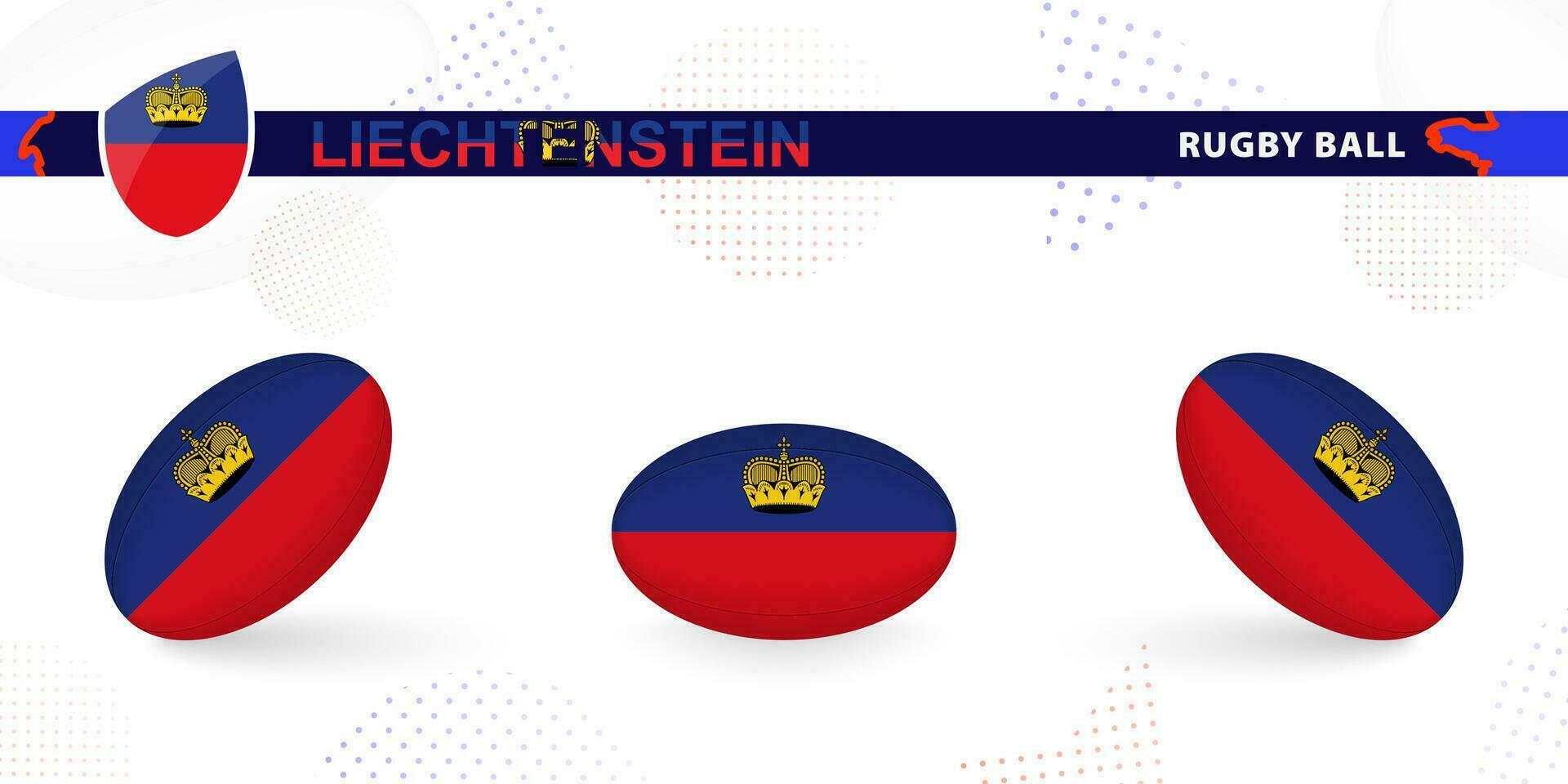 Rugby ball set with the flag of Liechtenstein in various angles on abstract background. Pro Vector