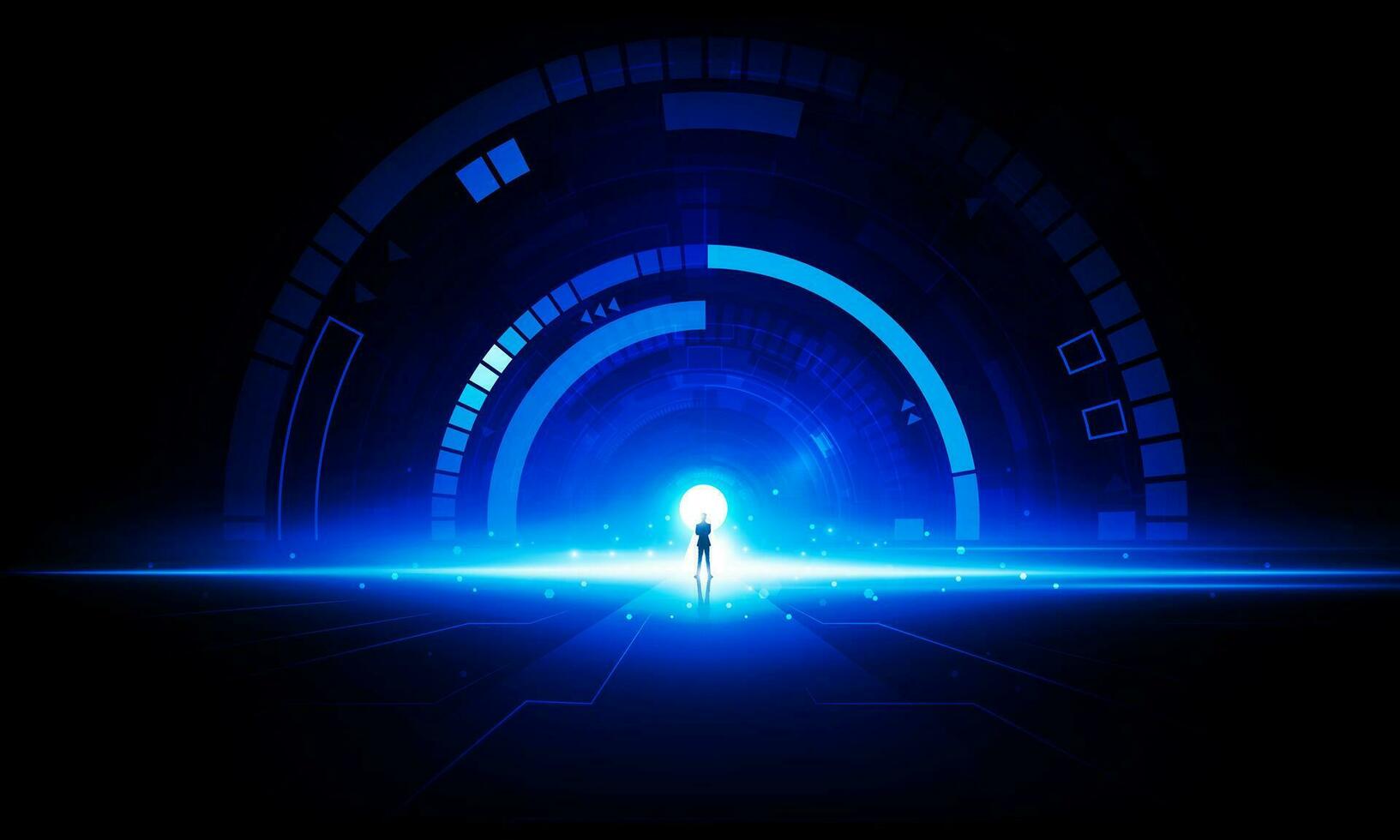 Abstract Businessman walks into the door of success open Light of technology background Hitech communication concept innovation background vector design. Pro Vector