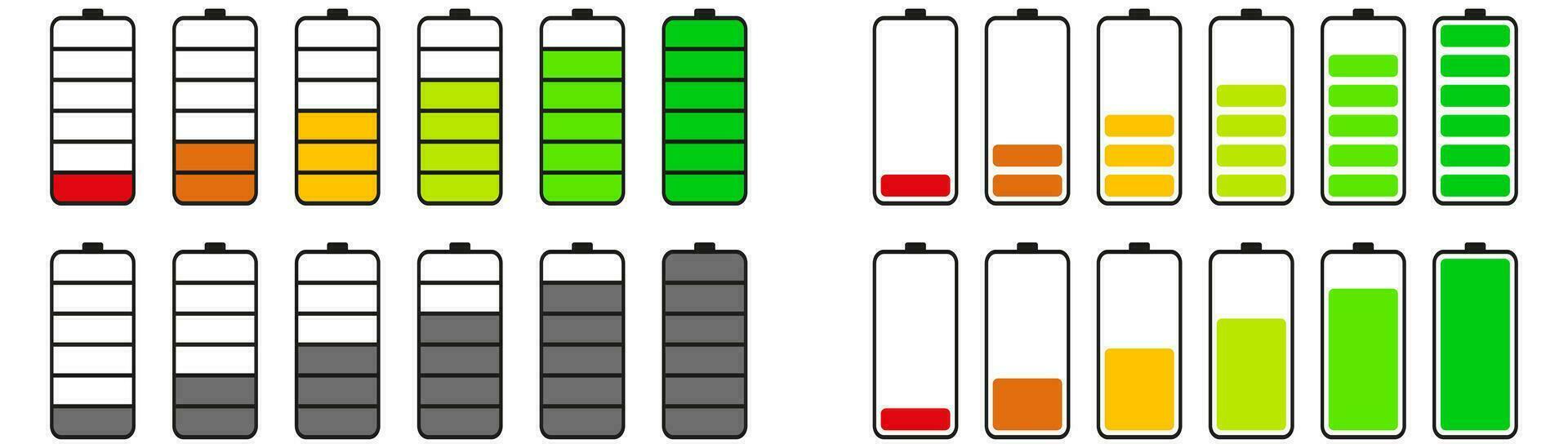 Mobile battery icons. Isolated battery indicator in flat. Mobile accumulator level. Low and high energy indicator. Capacity symbol set. Vector EPS 10 Pro Vector